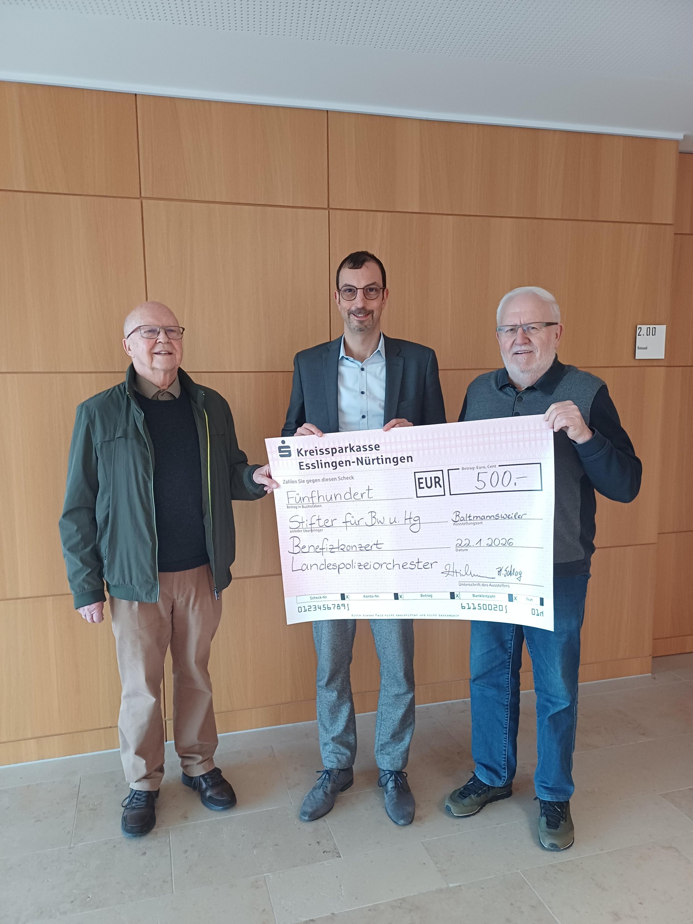 - Und last not least: Die Bürgerstiftung konnte sich über eine Spende (500 €) der Arbeitsgemeinschaft Baltmannsweiler und Hohengehrener Vereine (AGBHV) des Landespolizeiorchesters anlässlich des Benefizkonzerts im September freuen.